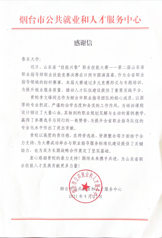 近日,鲁东大学物理与光电工程学院收到来自烟台市公共就业和人才服务中心的感谢信,信中对学院辅导员李文锋在山东省 “技能兴鲁” 职业技能大赛——第二届山东省职业指导师职业技能竞赛决赛中的突出表现,以及学院给予的大力支持予以高度肯定和诚挚感谢。