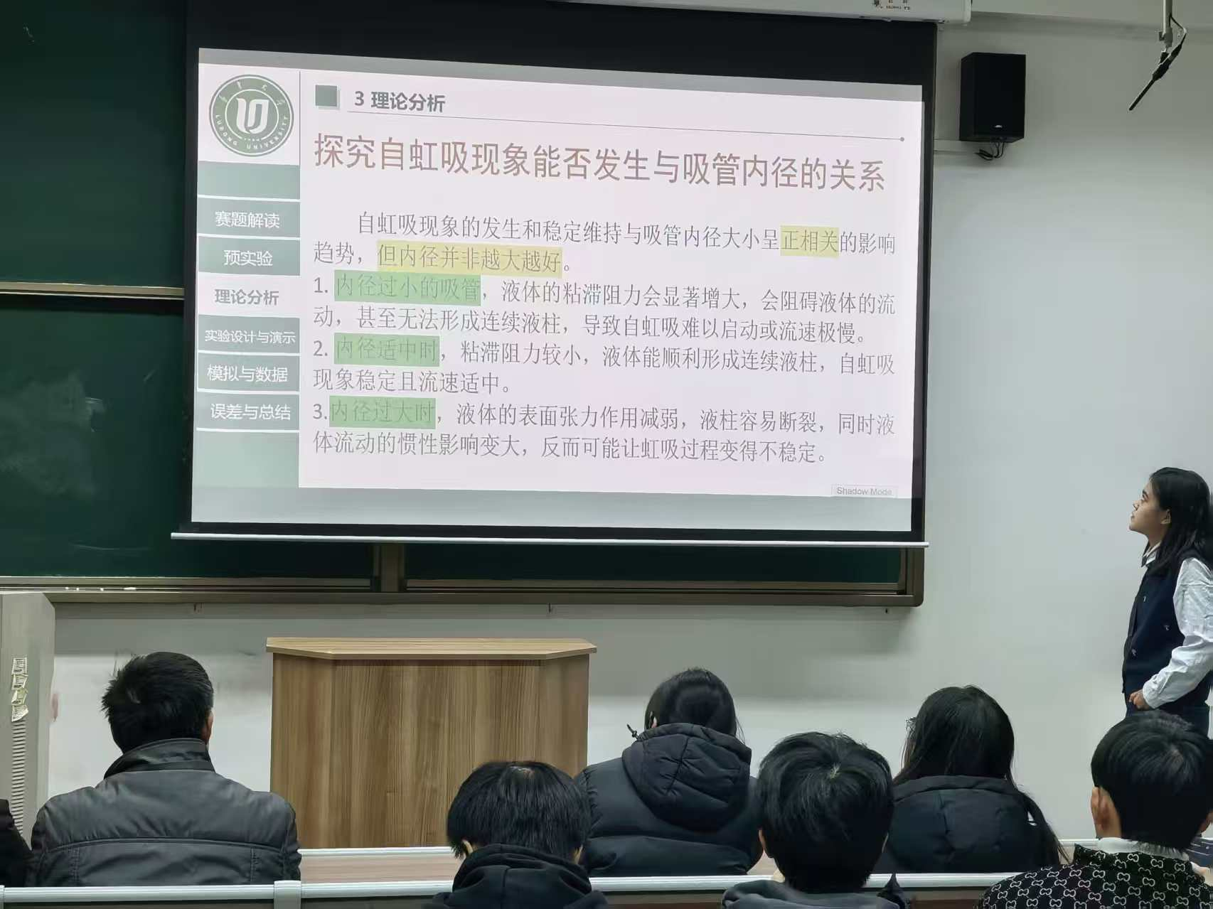 在激烈的比赛中,每个队伍都热情洋溢地展示了他们精心准备的研究成果,不仅分享了各自的发现和心得,还通过深入的讲解和生动的演示,让在场的每一个人都感受到了他们对课题的深刻理解和创新思考。评委老师以严谨的态度和专业的眼光,对每位选手的表现进行了全面细致的点评。不仅一针见血地指出了作品中存在的不足之处,还结合自身丰富的经验,提出了许多具有建设性和可操作性的修改意见,始终以鼓励和引导为主,与选手们展开了热烈而深入的探讨,共同挖掘作品更多的可能性,现场气氛既严肃又充满活力。中国大学生物理学术竞赛(CUPT)是我国借鉴国际青年物理学家锦标赛(The International Young Physicists' Tournament,IYPT)模式创办的一项全国性三级赛事,有省赛、华东区赛和全国比赛。CUPT竞赛旨在提高学生综合运用所学知识分析解决实际物理问题的能力,培养学生的开放性思维能力。参赛学生就实际物理问题的基本知识、理论分析、实验研究、误差分析、结果讨论等进行辩论性比赛。这种模式不仅可以锻炼学生分析问题、解决问题的能力,提高科研素养,还能培养学生的创新意识、团队合作精神、交流表达能力,使学生的知识、能力和素质得到全面协调发展。