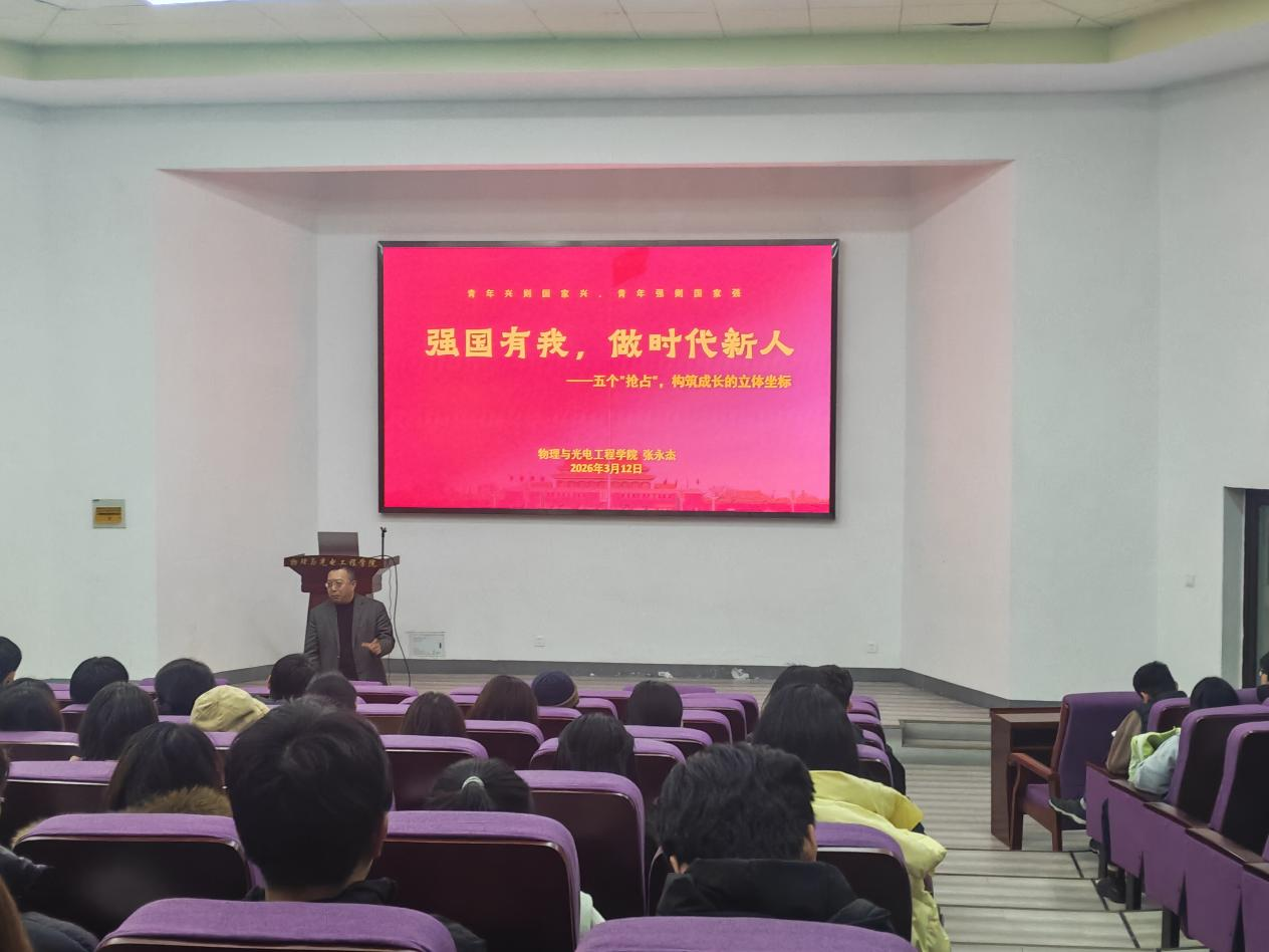 3月12日,物理与光电工程学院党委副书记张永杰以《强国有我,做时代新人》为题,为2025级学生讲授了一堂内容丰富、思想深刻的形势与政策课,课程围绕“五个‘抢占’”展开,引导青年学生在网络空间、教室、操场、图书馆和实验室五个关键领域中主动作为、奋发成长,争做担当民族复兴大任的时代新人。