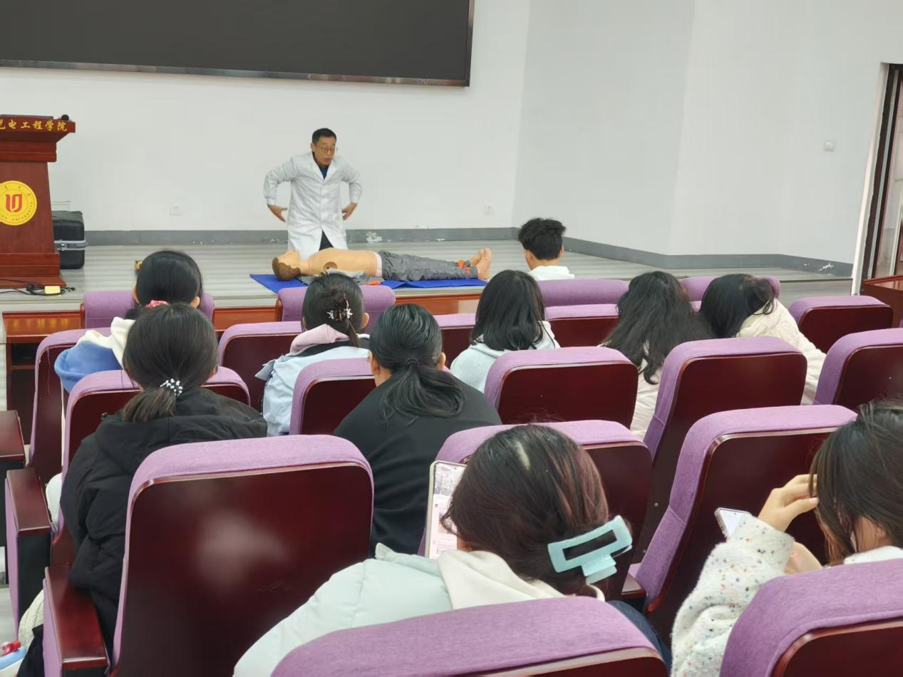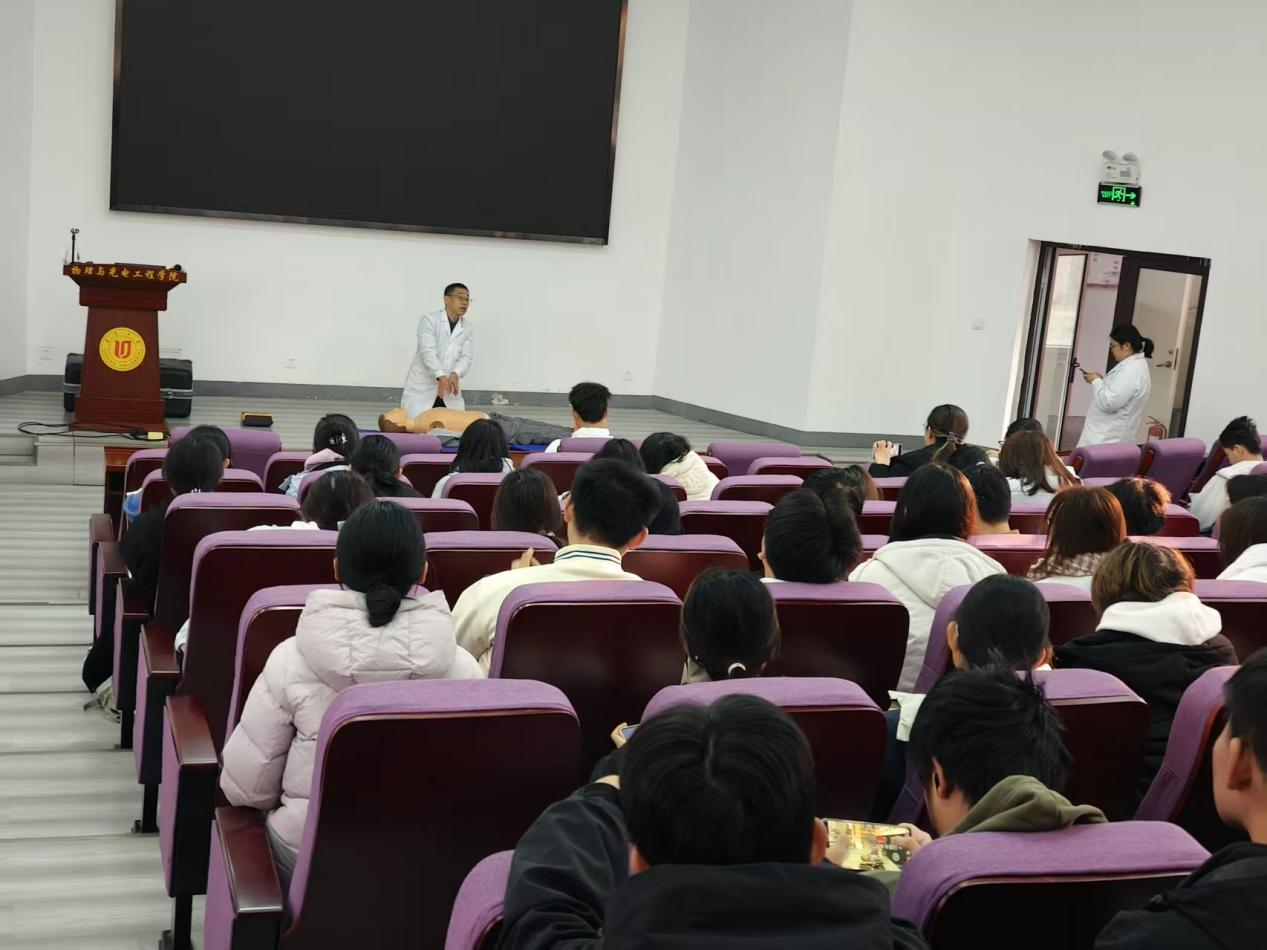 培训中,医师围绕急救基本常识、心肺复苏术、AED 使用、急救知识问答四大模块展开讲解,用通俗易懂的语言阐释急救知识的重要性,引导同学们树立正确的安全防护与应急救助观念。
