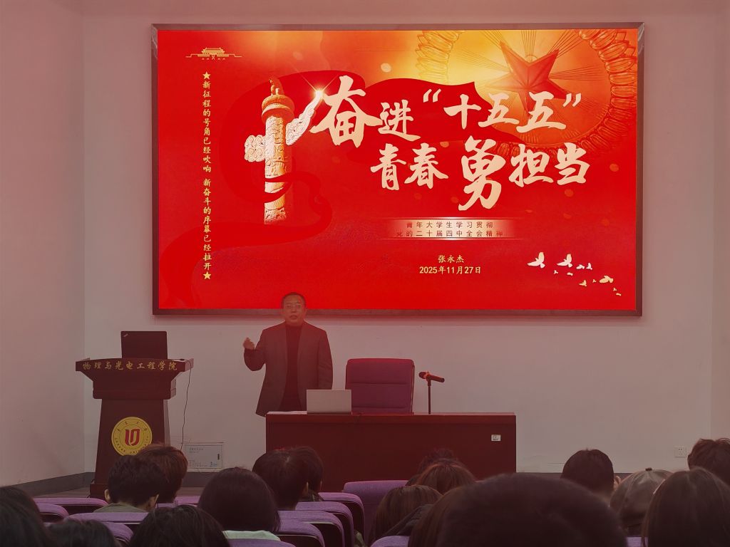 为深入学习贯彻党的二十届四中全会精神,引导青年学生深刻把握国家发展大势与时代使命,1127日,物理与光电工程学院党委副书记张永杰以《奋进“十五五”,青春勇担当》为题,为2025级学生讲授了一堂主题鲜明、内容丰富的形势与政策课。